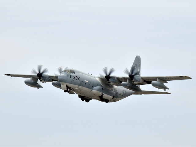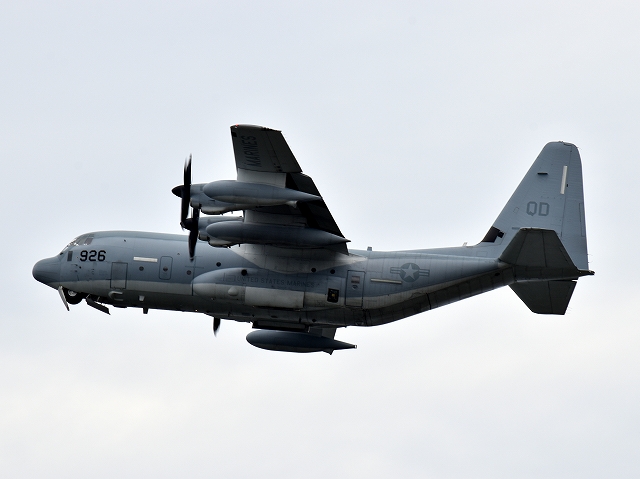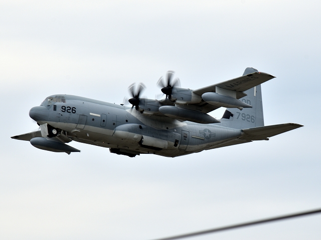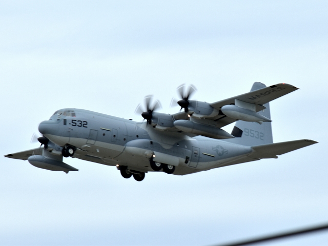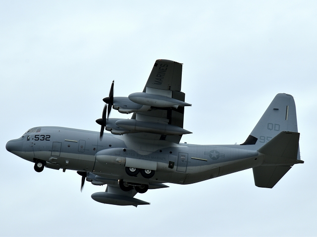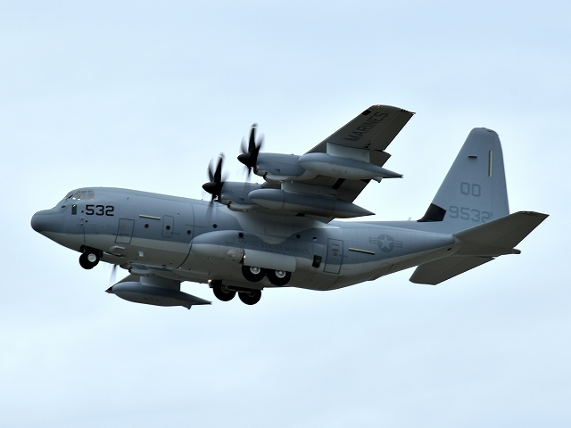 米海兵隊 KC-130J 空中給油機 スーパーハーキュリーズ(岩国基地)、9532番機が旋回(6周目) |
