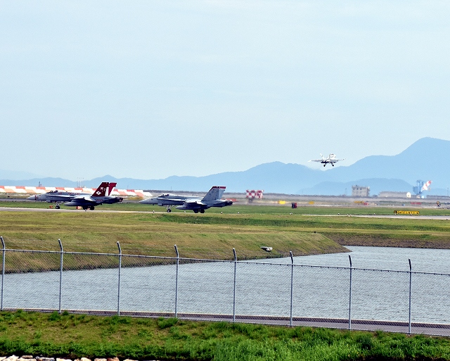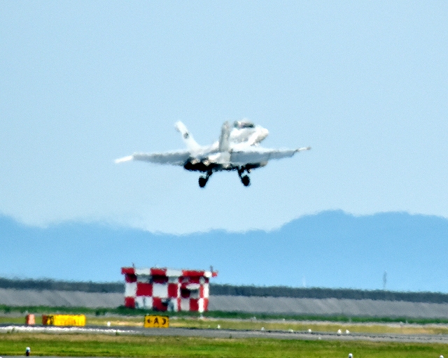 米海兵隊 F/A-18D ホーネット 戦闘攻撃機(岩国基地)、DT、06番機がタッチアンドゴーして旋回(7周目) 待つは、米海兵隊 F/A-18C ホーネット 戦闘攻撃機(岩国基地)、WT、01番機、02番機 |