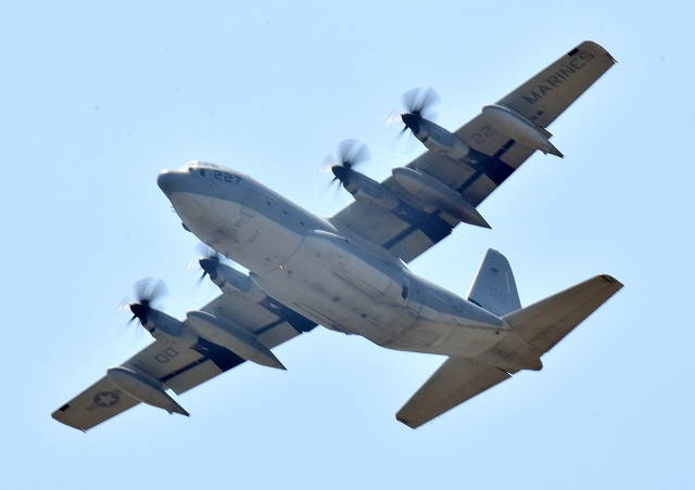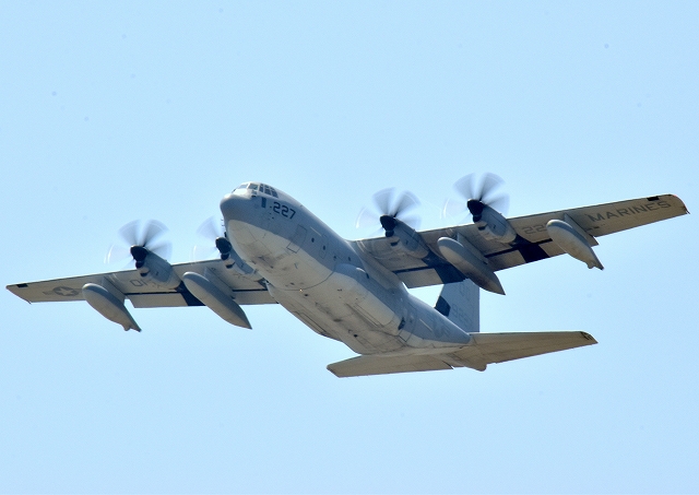 米海兵隊 KC-130J 空中給油機 スーパーハーキュリーズ(岩国基地)、9227番機が離陸 |