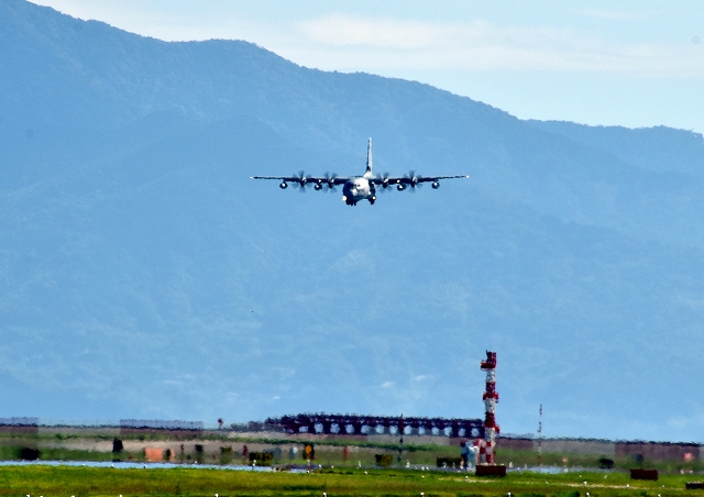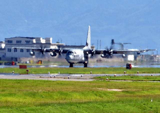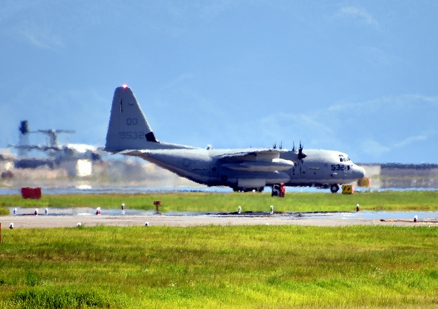 米海兵隊 KC-130J 空中給油機 スーパーハーキュリーズ(岩国基地)、9532番機がいったん着陸 |