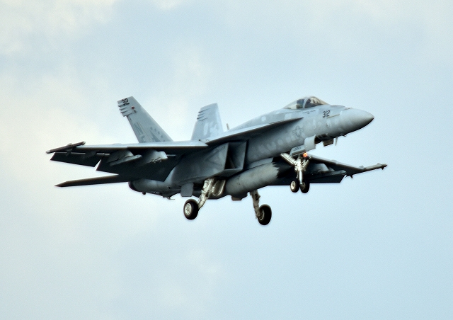 米海軍艦載機 F/A-18E スーパーホーネット 戦闘攻撃機(岩国基地)、NF、312番機が着陸。前に光学着艦装置