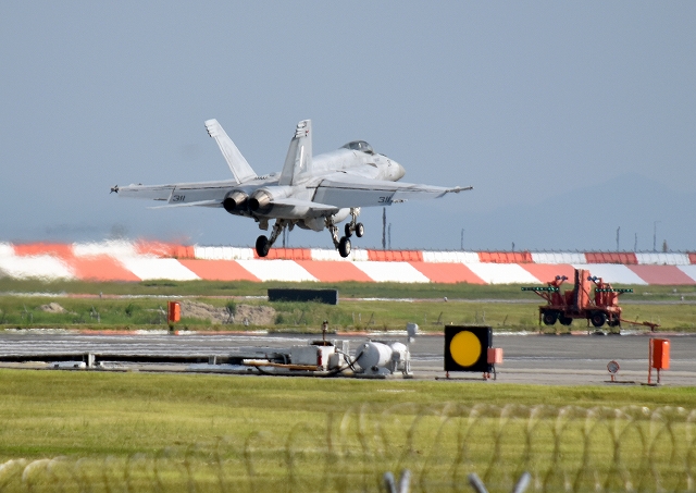 米海軍艦載機 F/A-18E スーパーホーネット 戦闘攻撃機(岩国基地)、NF、311番機が着陸。前に光学着艦装置