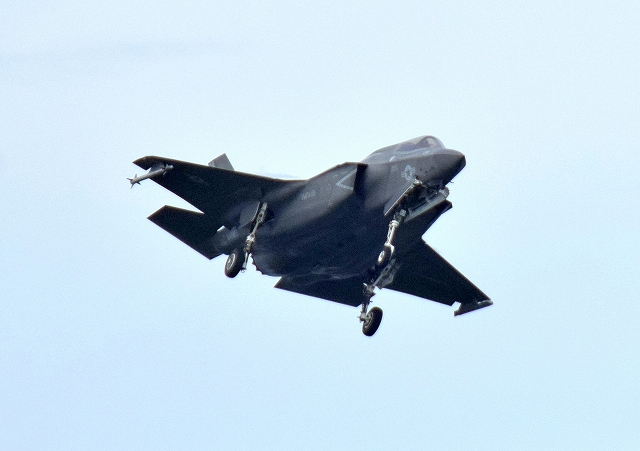 米海兵隊 F-35B ステルス 戦闘機(岩国基地)、VK、04番機が着陸 13時05分離陸ですから、1時間18分の飛行でした。 |