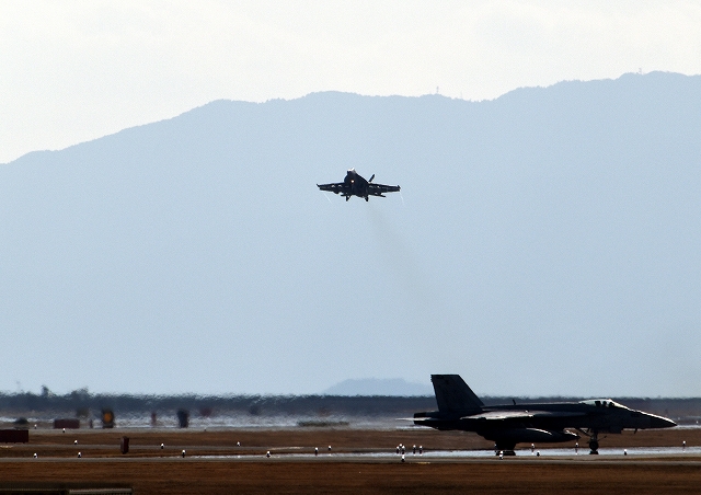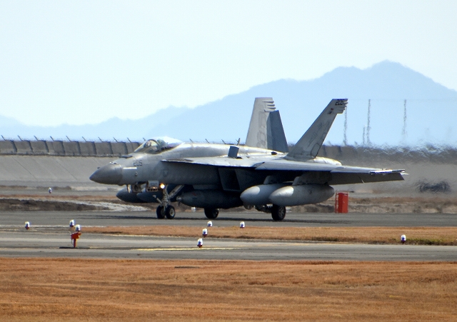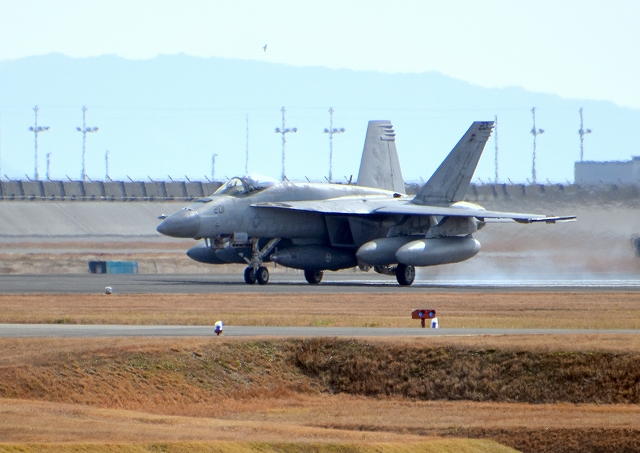 米海軍艦載機 F/A-18E スーパーホーネット 戦闘攻撃機(岩国基地)、NF、201番機が着陸 |