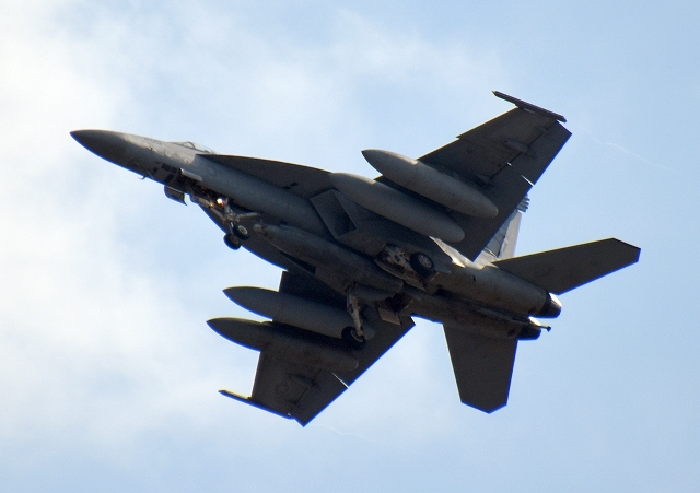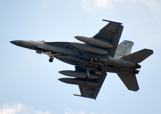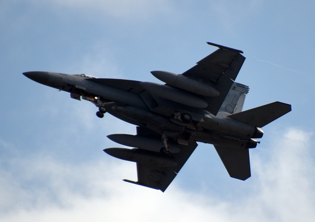 米海軍艦載機 F/A-18E スーパーホーネット 戦闘攻撃機(岩国基地)、NF、205番機が旋回(2周目) |
