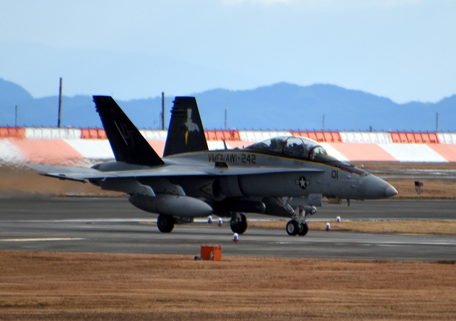 米海兵隊 F/A-18D ホ ーネット 戦闘攻撃機(岩国基地)、DT、01番機が着陸 13時25分に離陸した機。1時間28分の飛行でした。 |