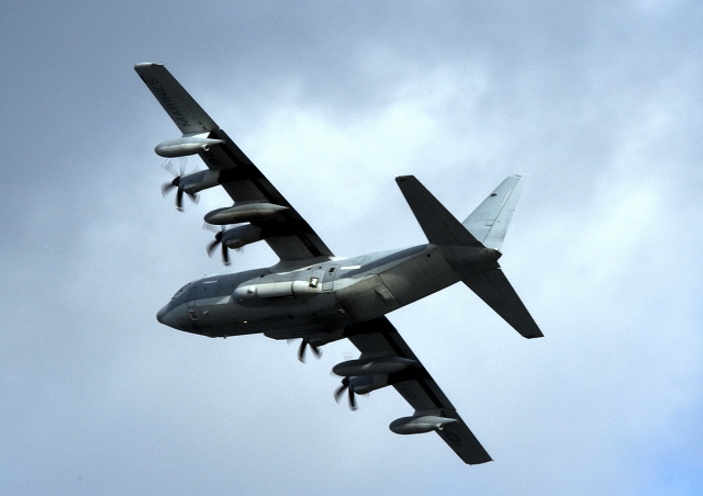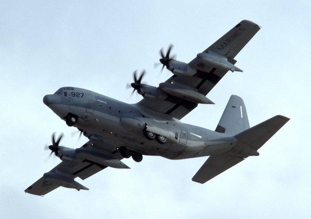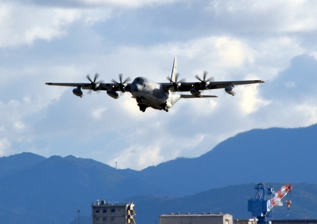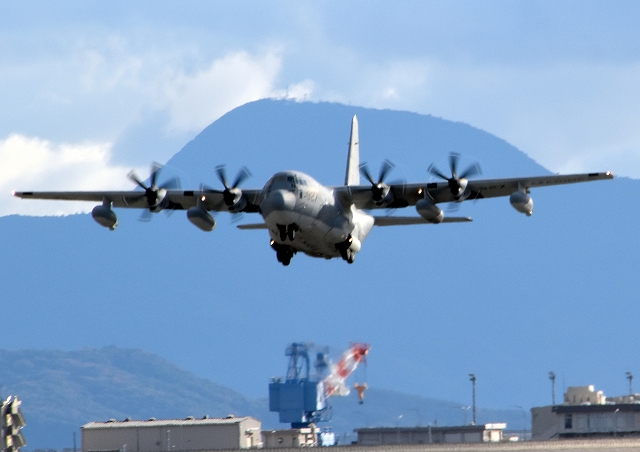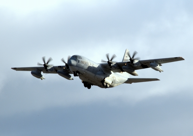 米海兵隊 KC-130J 空中給油機 スーパーハーキュリーズ(岩国基地)、7925番機が離陸 |