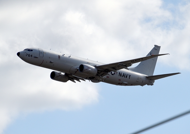 米海軍 P-8A 対潜哨戒機 ポセイドン(嘉手納基地)、LN、764番機が旋回(8周目) |