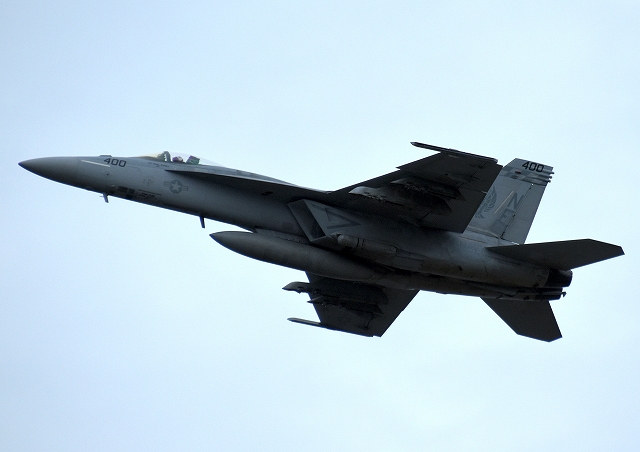 米海軍艦載機 F/A-18E スーパーホーネット 戦闘攻撃機(岩国基地)、NF、400番機が離陸 |