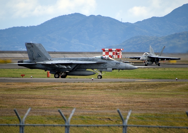 米海軍艦載機 F/A-18E スーパーホーネット 戦闘攻撃機(岩国基地)、NF、305番機、304番機が帰還 |