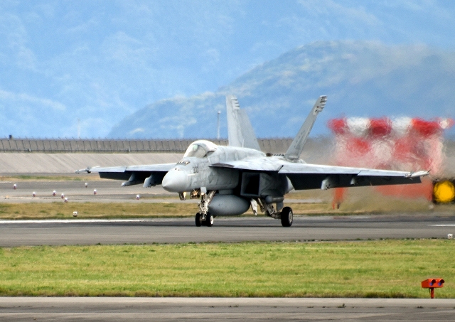 米海軍艦載機 F/A-18E スーパーホーネット 戦闘攻撃機(岩国基地)、NF、305番機が着陸 14時30分離陸ですから、1時間29分の飛行でした。 |