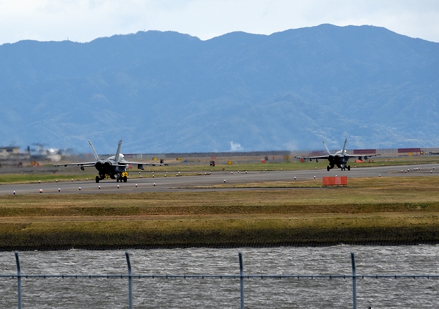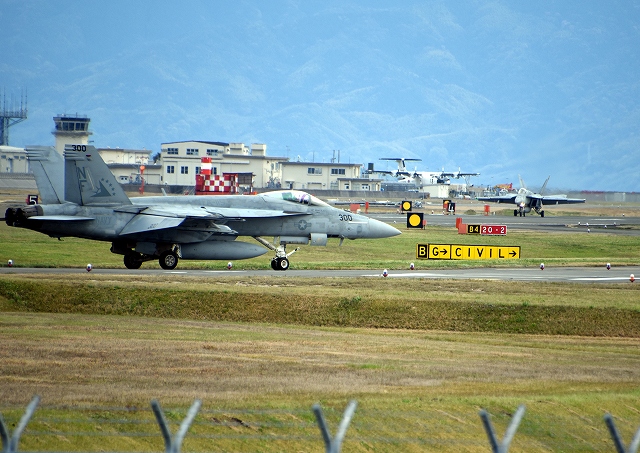 米海軍艦載機 F/A-18E スーパーホーネット 戦闘攻撃機(岩国基地)、NF、300番機、310番機は米海軍艦載機駐機場に戻ります。このあたりでサヨナラ。 |