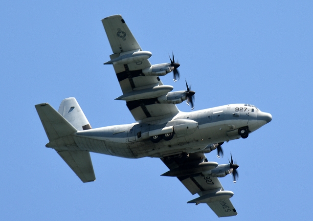 米海兵隊 KC-130J 空中給油機 スーパーハーキュリーズ(岩国基地)、7927番機が旋回(2周目) |