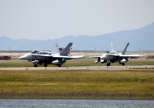 米海兵隊 F/A-18C ホーネット 戦闘攻撃機(岩国基地)、VE、11番機、DR 206番機が離陸 |