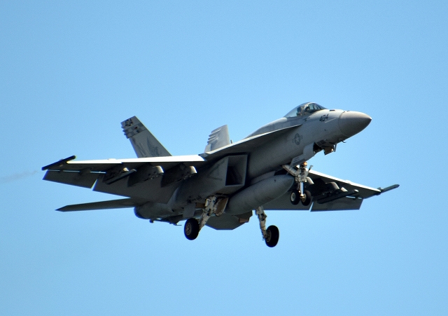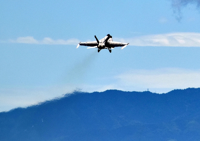 米海軍艦載機 F/A-18E スーパーホーネット 戦闘攻撃機(岩国基地)、NF、404番機がタッチアンドゴーして旋回(1周目) 下に光学式着艦誘導装置 |