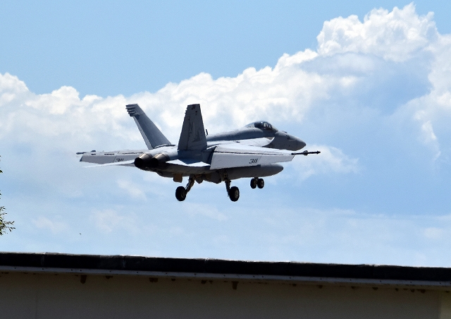 米海軍艦載機 F/A-18E スーパーホーネット 戦闘攻撃機(岩国基地)、NF、311番機もタッチアンドゴーして旋回(1周目) |