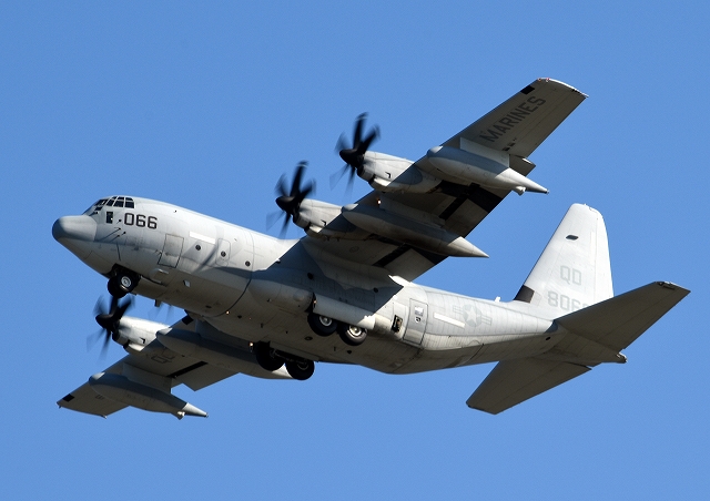 米海兵隊 KC-130J 空中給油機 スーパーハーキュリーズ(岩国基地)、8066番機が旋回(9周目) |