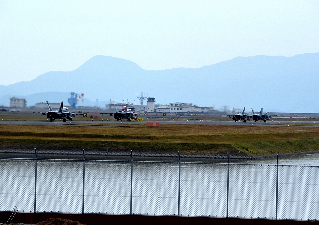米海兵隊 F/A-18D ホ ーネット 戦闘攻撃機(岩国基地)、ED、13番機、01番機 13時56分離陸ですから、1時間21分の飛行でした。 |