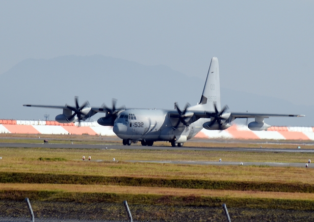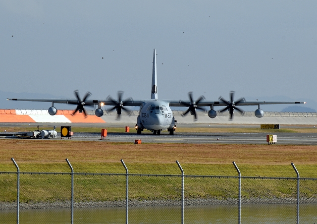 米海兵隊 KC-130J 空中給油機 スーパーハーキュリーズ(岩国基地)、9535番機が着陸 |