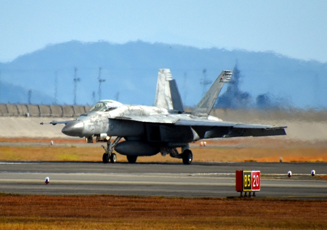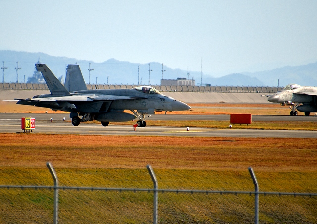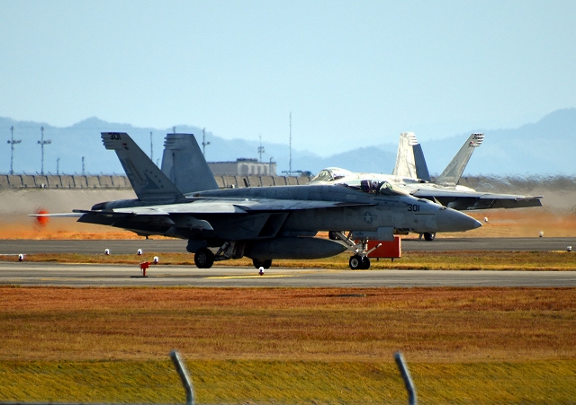 米海軍艦載機 F/A-18E スーパーホーネット 戦闘攻撃機(岩国基地)、NF、301番機が着陸 |