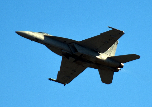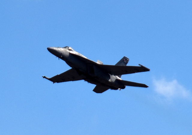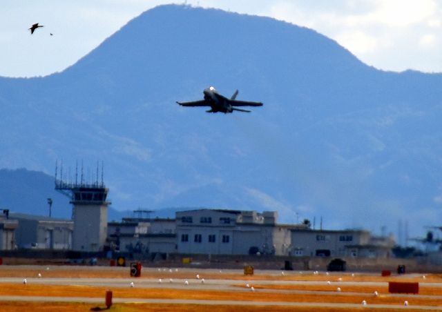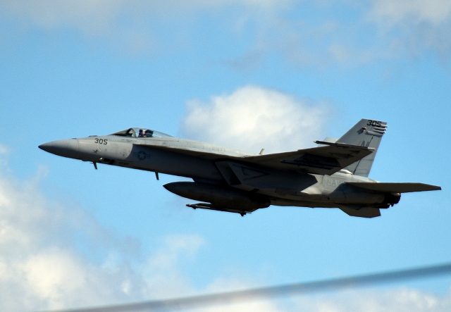 米海軍艦載機 F/A-18E スーパーホーネット 戦闘攻撃機(岩国基地)、NF、305番機が離陸 |