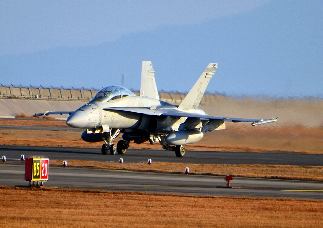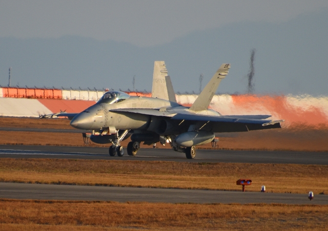 米海兵隊 F/A-18C ホーネット 戦闘攻撃機(岩国基地)、DR 208番機が着陸 14時39分に離陸した機。1時間10分の飛行でした。 |