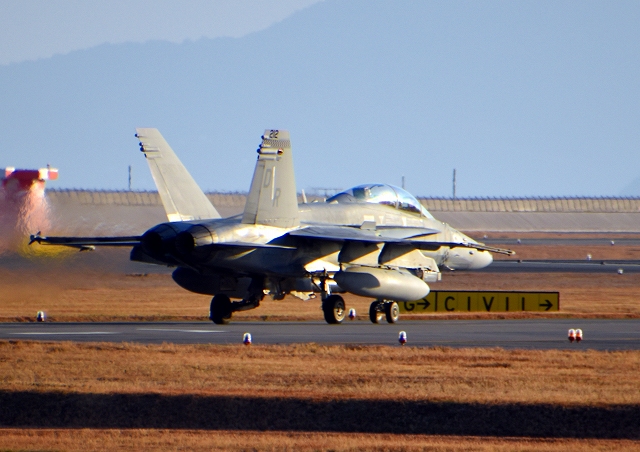 米海兵隊 F/A-18D ホーネット 戦闘攻撃機(岩国基地)、DR 214番機が着陸 14時35分に離陸した機。1時間11分の飛行でした。 |