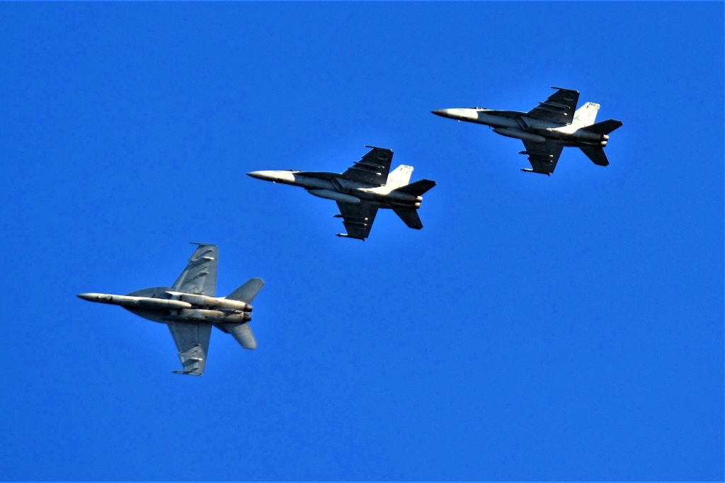 米海軍艦載機 F/A-18E スーパーホーネット 戦闘攻撃機(岩国基地)、NF、303番機、302番機、307番機が帰還