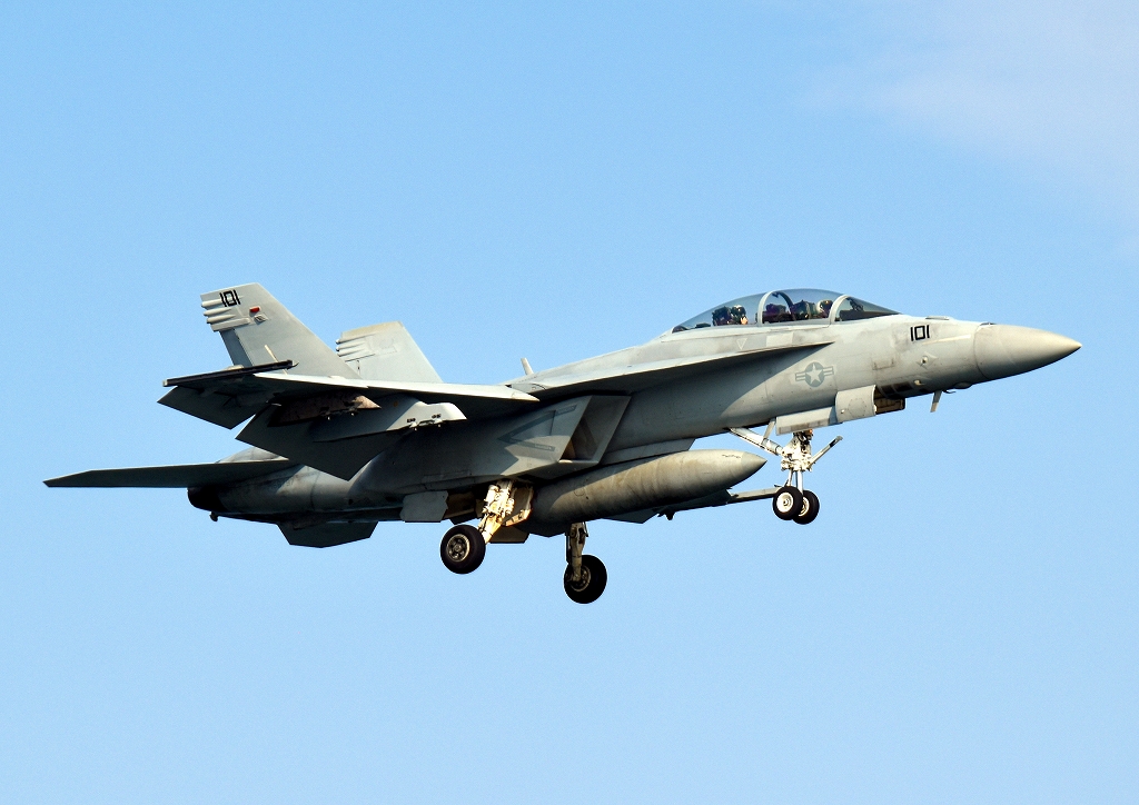 米海軍艦載機 F/A-18F スーパーホーネット 戦闘攻撃機(岩国基地)、NF、101番機が帰還、着陸