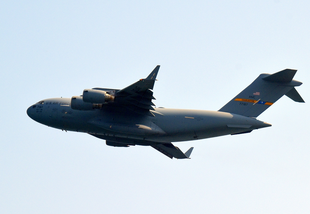 米空軍 C-17A ジェット輸送機 グローブマスターⅢ AMC 77187番機が離陸