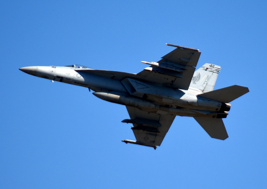 米海軍艦載機 F/A-18E スーパーホーネット 戦闘攻撃機(岩国基地)、NF、411番機が離陸