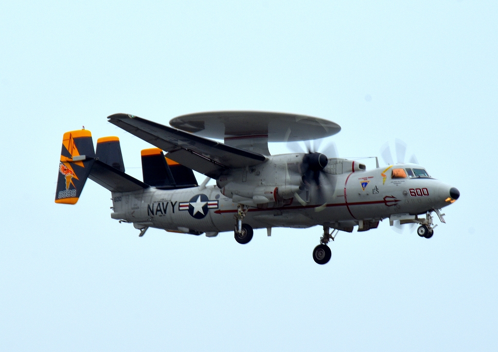 米海軍艦載機 E-2D アドヴァンスド・ホークアイ 早期警戒機(岩国基地)、600番機が着陸