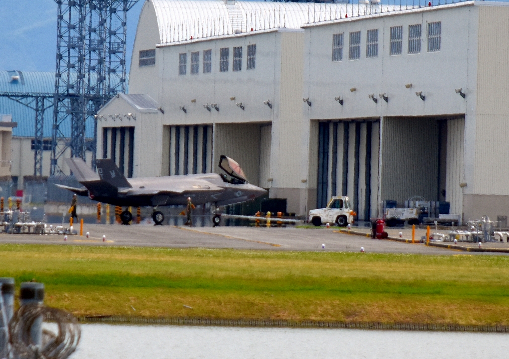 米海兵隊 F-35B ライトニングⅡ 戦闘機(岩国基地)、DT、03番機はメンテナンス終えて格納庫に入ります。