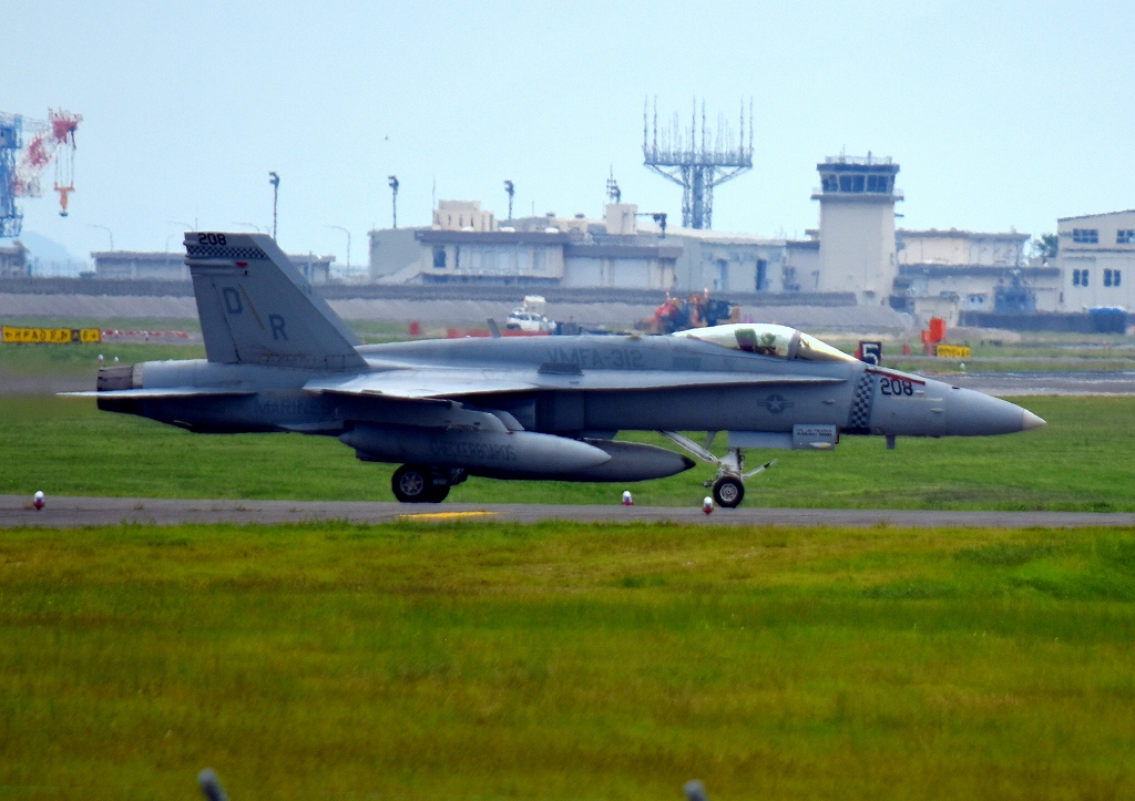 米海兵隊 F/A-18C ホーネット 戦闘攻撃機(岩国基地)、DR 208番機が帰還、着陸