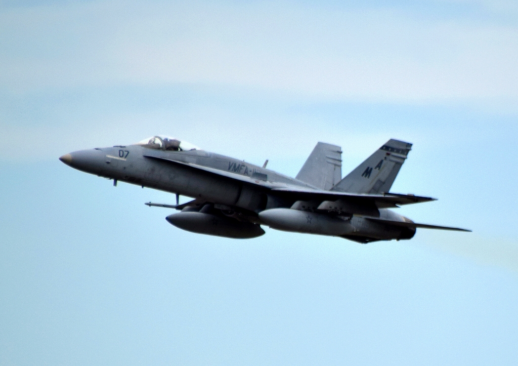 米海兵隊 F/A-18 ホーネット 戦闘攻撃機(岩国基地)、MA 07番機が離陸
