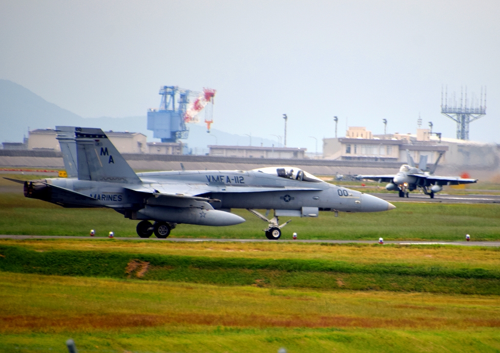 米海兵隊 F/A-18 ホーネット 戦闘攻撃機(岩国基地)、MA 00番機、07番機が着陸