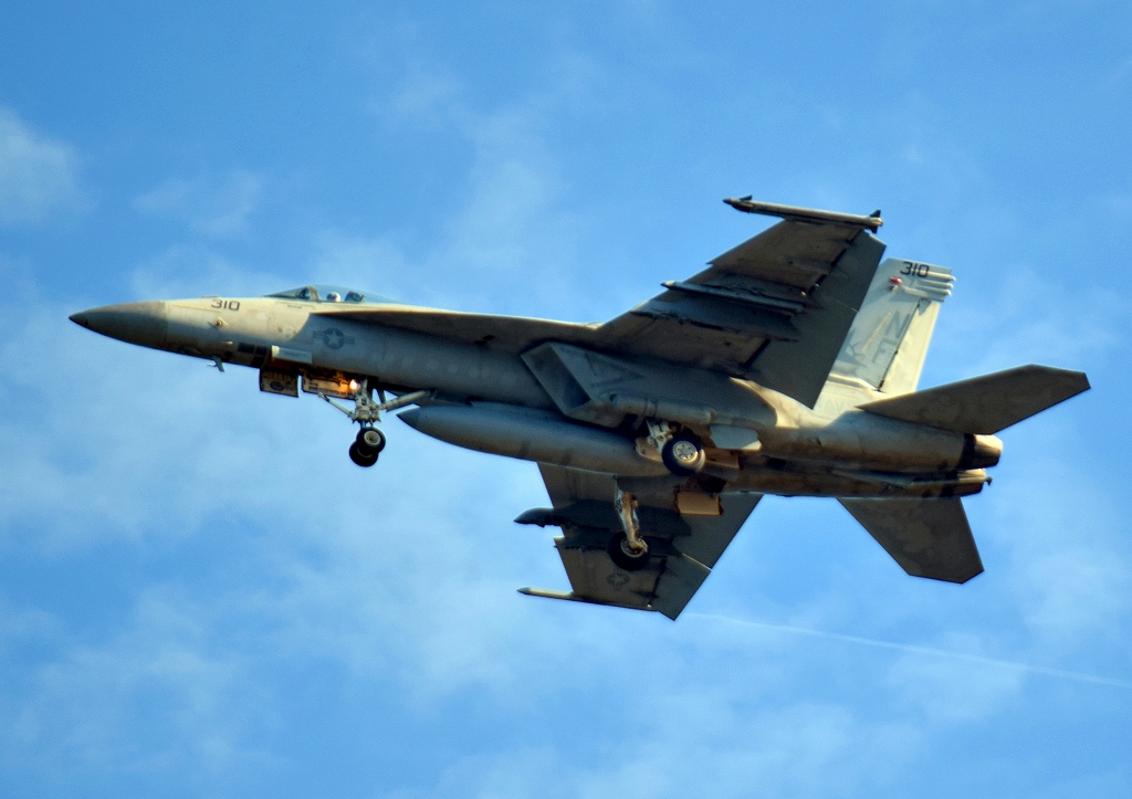 米海軍艦載機 F/A-18E スーパーホーネット 戦闘攻撃機(岩国基地)、NF、310番機がタッチアンドゴーして旋回