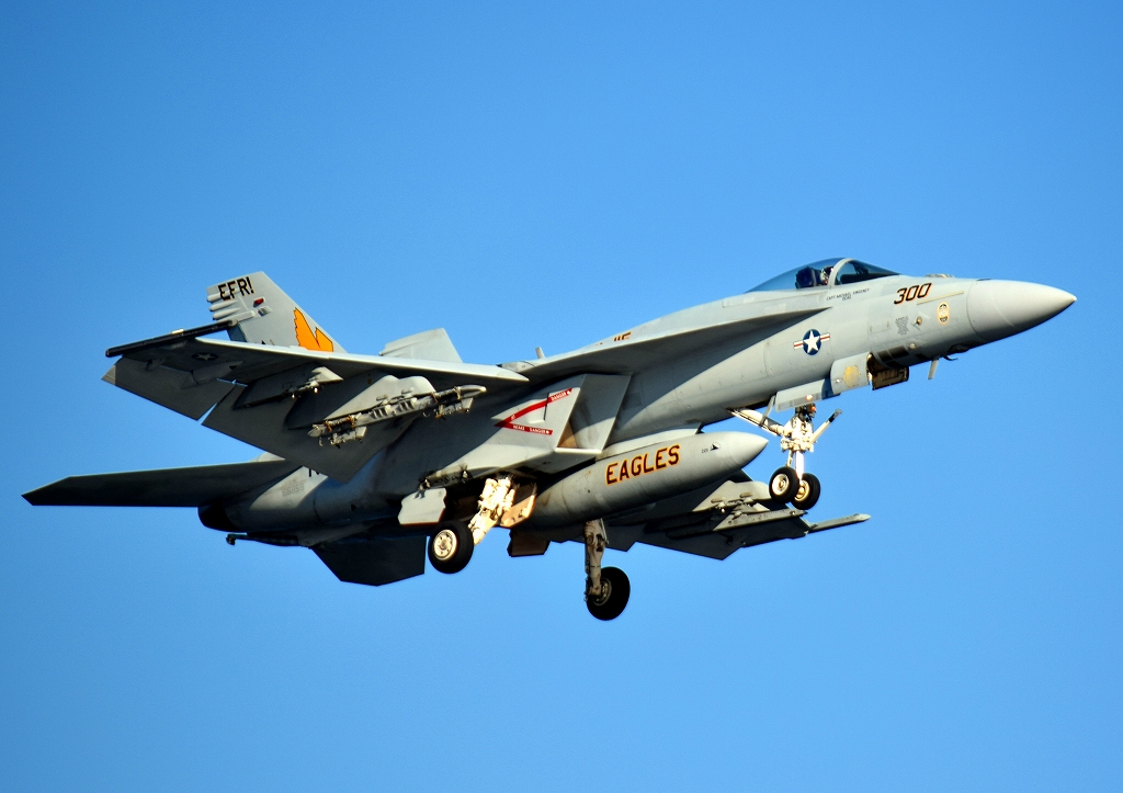 米海軍艦載機 F/A-18E スーパーホーネット 戦闘攻撃機(岩国基地)、NF、300番機が帰還、着陸