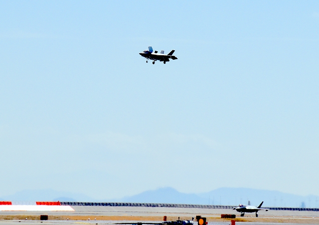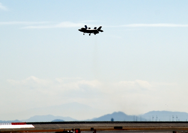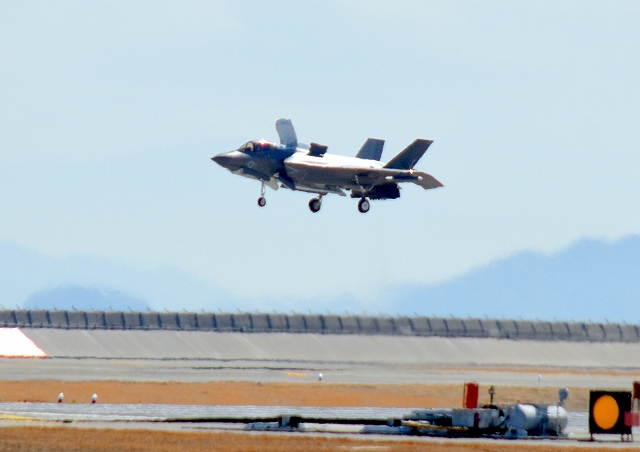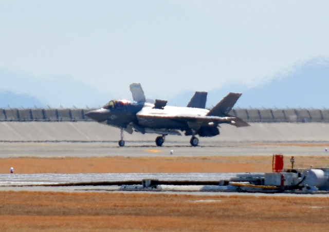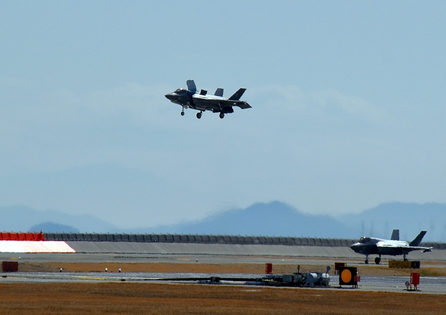 米海兵隊 F-35B ライトニングⅡ 戦闘機(岩国基地)、VK、05番機が帰還、垂直離着陸パッドの上でホバリング |
