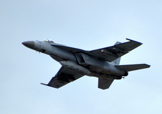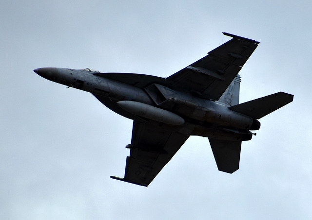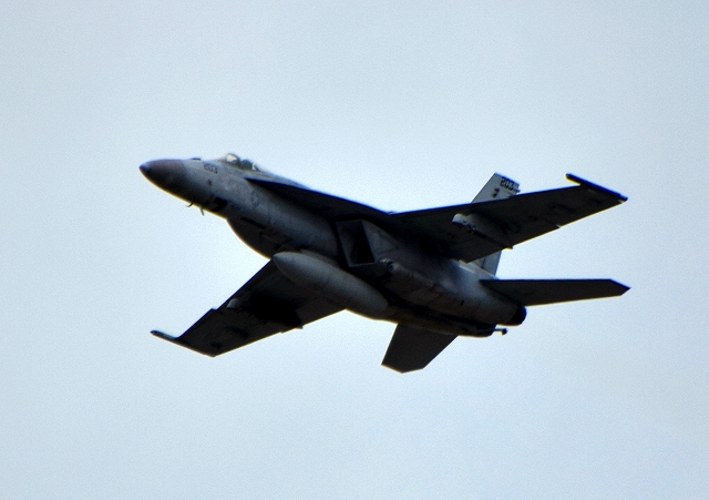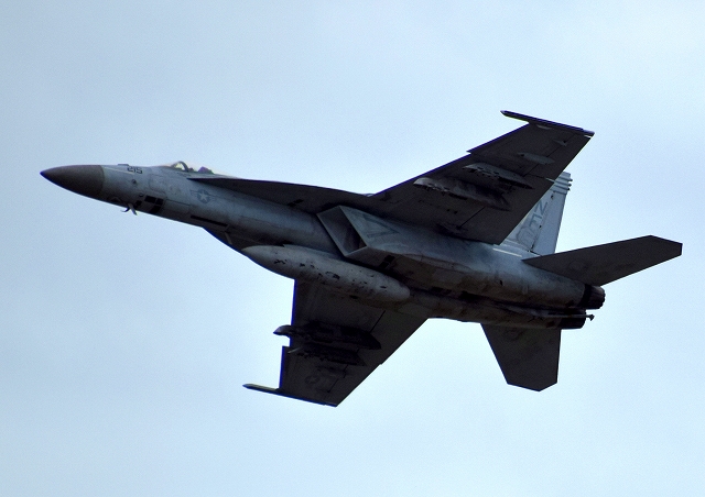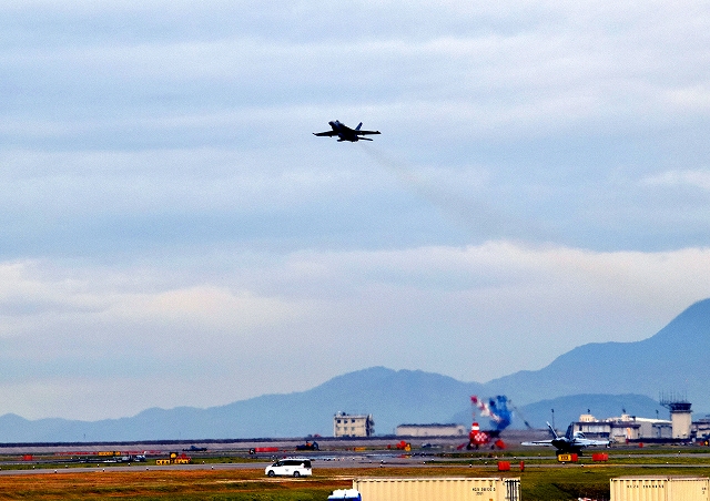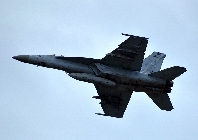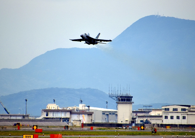 米海軍艦載機 F/A-18E スーパーホーネット 戦闘攻撃機(岩国基地)、NF、215番機が離陸 |