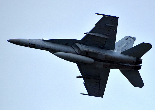 米海軍艦載機 F/A-18E スーパーホーネット 戦闘攻撃機(岩国基地)、NF、203番機が離陸 |