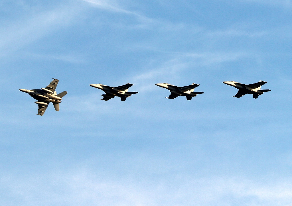 米海軍艦載機 F/A-18E スーパーホーネット 戦闘攻撃機(岩国基地)、NF、301番機、214番機、211番機、203番機が4機編隊で帰還