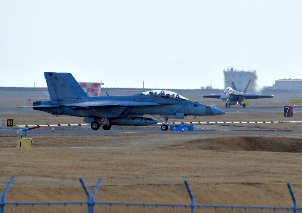 米海軍艦載機 F/A-18F スーパーホーネット 戦闘攻撃機(岩国基地)、NF、116番機、103番機が帰還、着陸