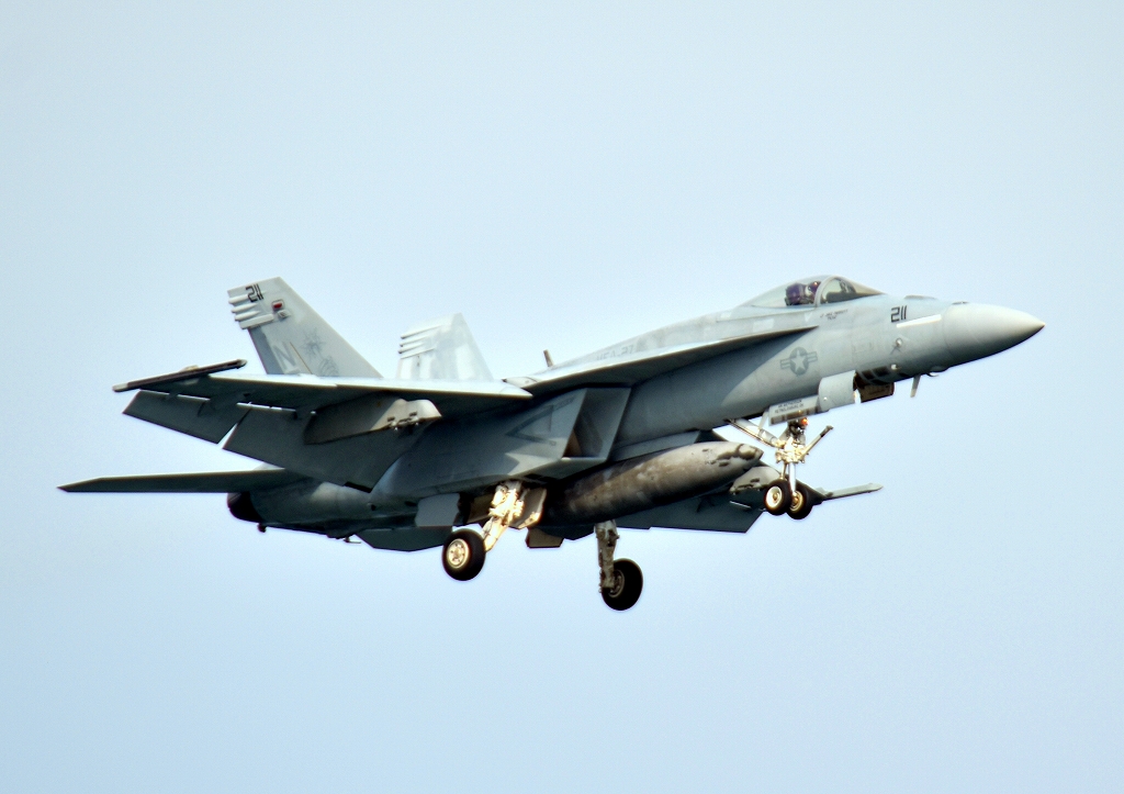 米海軍艦載機 F/A-18E スーパーホーネット 戦闘攻撃機(岩国基地)、NF、211番機が帰還、着陸