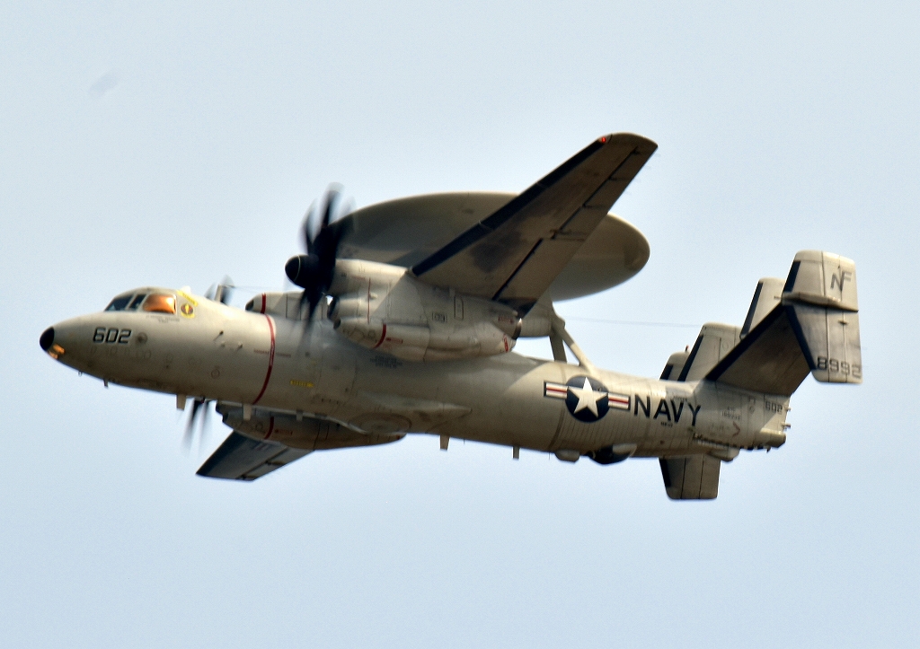 米海軍艦載機 E-2D アドヴァンスド・ホークアイ 早期警戒機(岩国基地)、602番機が旋回(2周目)
