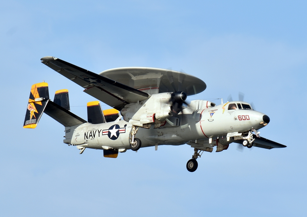 米海軍艦載機 E-2D アドヴァンスド・ホークアイ 早期警戒機(岩国基地)、600番機が帰還、旋回