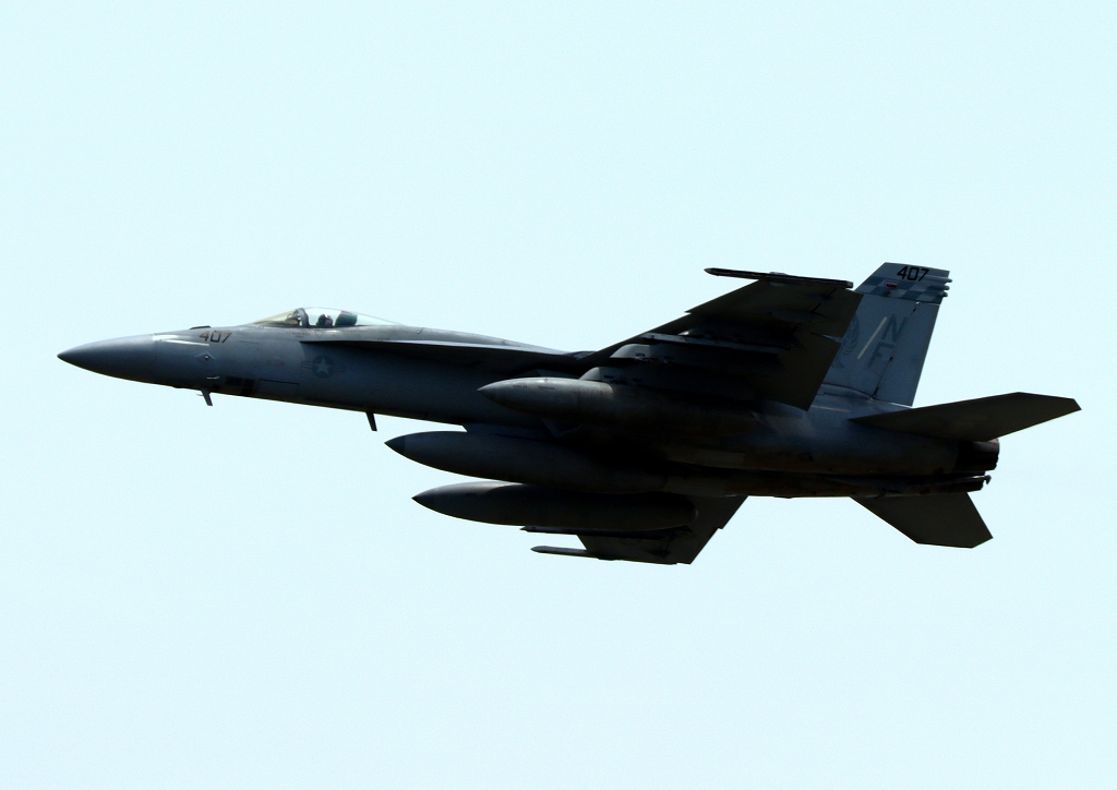 米海軍艦載機 F/A-18E スーパーホーネット 戦闘攻撃機(岩国基地)、NF、407番機が離陸