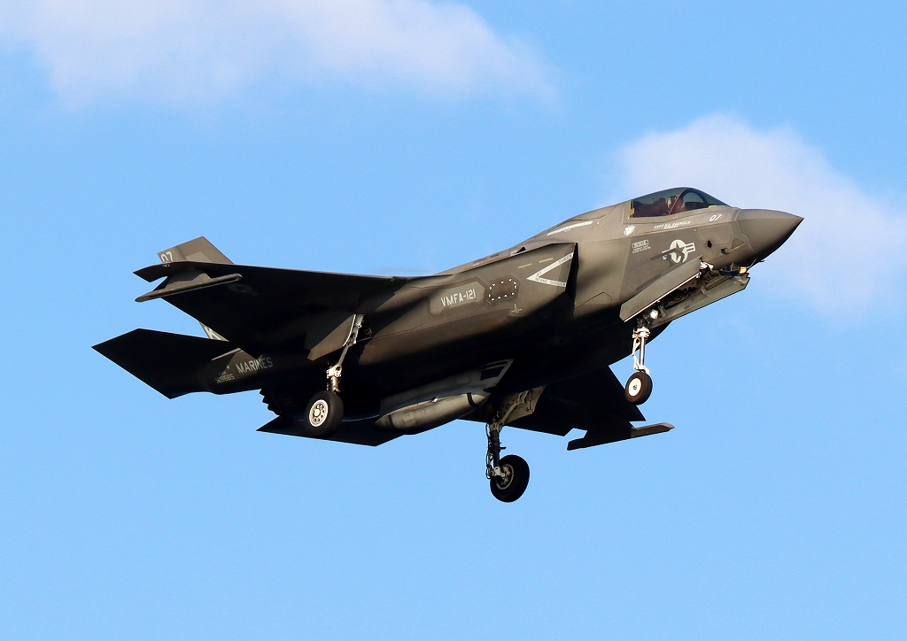 米海兵隊 F-35B ライトニングⅡ 戦闘機(岩国基地)、VK、07番機が旋回。ガンポッド搭載