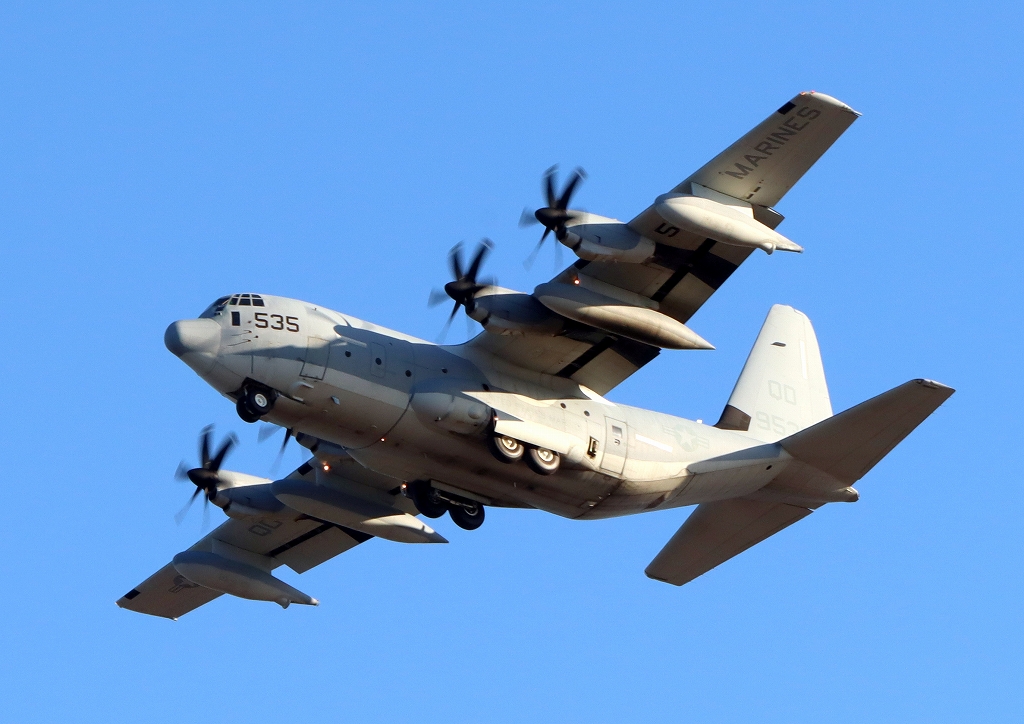 米海兵隊 KC-130J 空中給油機 スーパーハーキュリーズ(岩国基地)、9535番機が旋回(4周目)