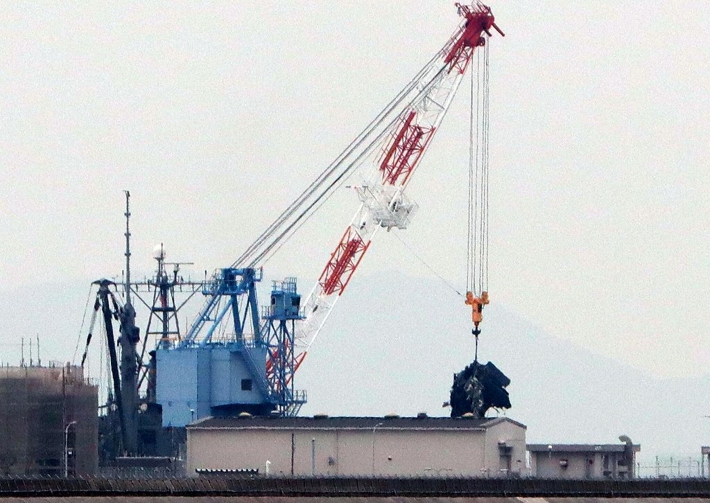 サルベージ船「サルボア」から、クレーンで、オスプレイの機体の一部と見られる残骸が陸揚げされています。